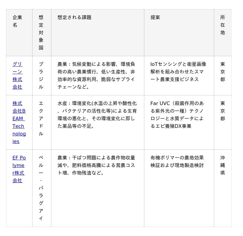 国際協力機構(JICA)は、2025年7月14日、「オープンイノベーションチャレンジTSUBASA」の対象として中南米・カリブ地域へのビジネス展開を検討する日本のスタートアップ企業8社を採択しました。今後6カ月間にわたり、採択企業への事業展開支援を行います。