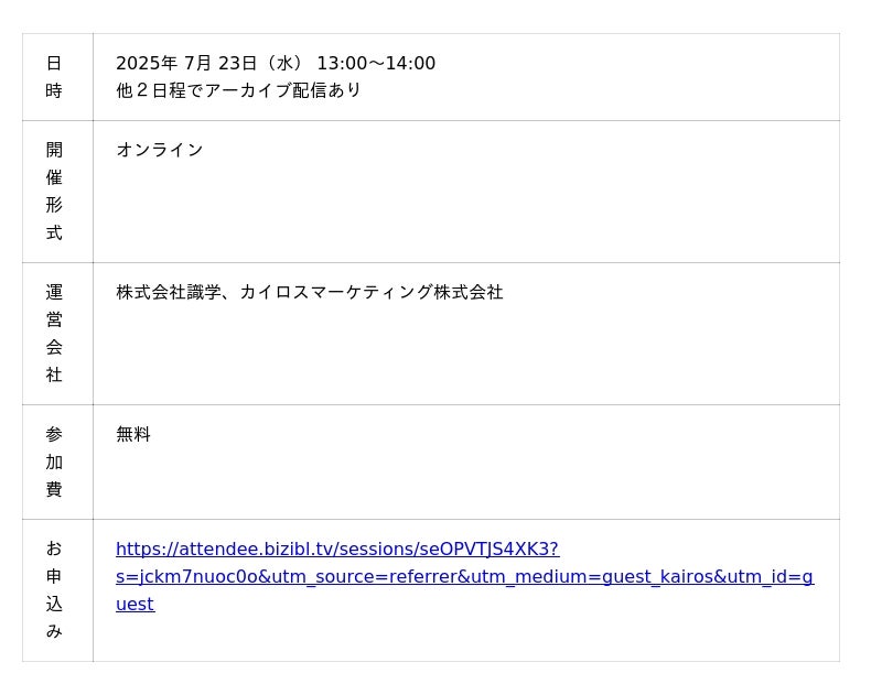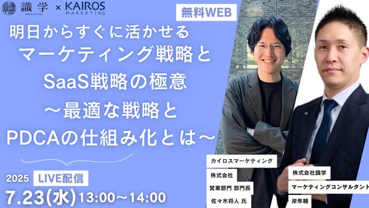 “次の一手”がデータでわかるMA+SFA一体型ツール「Kairos3(カイロススリー)」を提供するカイロスマーケティング株式会社(本社:東京都渋谷区、代表取締役:佐宗 大介、以下「当社」)は、株式会社識学との共催で、オンラインセミナー「明日からすぐに活かせるマーケティング戦略とSaaS戦略の極意 ~最適な戦略とPDCAの仕組み化とは~」を開催いたします。