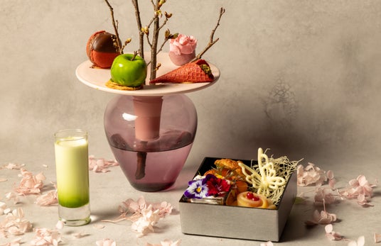 さまざまな味を手軽に楽しめる、プチスイーツを集めたアフタヌーンティー。室内でも春の風情を感じられるように、桜の枝を花瓶に活け、その周りに美しく配置されたスイーツが彩りを添えます。蓋を開けた瞬間のワクワク感が魅力の小箱には、4種のスイーツが詰められ、視覚でも味覚でも春を満喫できます。