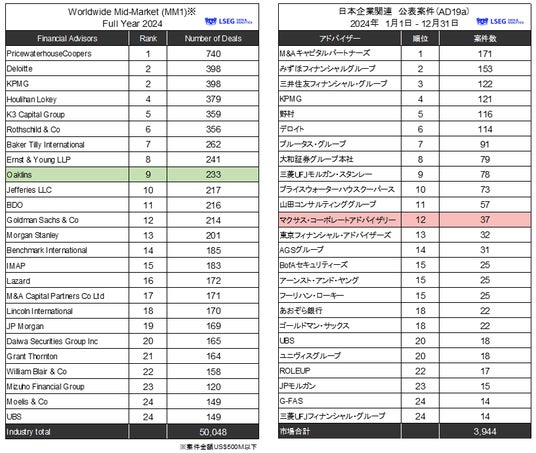 Oaklinsは、世界40ヵ国以上・60拠点を構える独立系M&Aファームのネットワークであり、800名を超えるプロフェッショナルが在籍しています。これまでに累計5,000件以上のM&A案件を手掛け、うち30%以上がクロスボーダー取引です。主に500万~1億米ドル規模の中堅企業向けM&Aを中心に、15の業界専門チームによる深い業界知見とグローバルネットワークを活かして、売却・買収・資金調達など多様なニーズに対応しており、LSEG発表の「Global M&A Mid-Market Advisory Full Year 2024」において、9位にランキングされております。