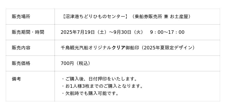 現在、千鳥観光汽船の乗船記念として人気の「御船印」シリーズに、夏限定の新デザインとして『クリア御船印』を、2025年7月19日(土)~9月30日(火)まで期間限定販売を行います。