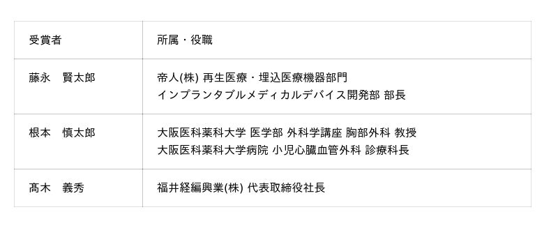 また、バイオインダストリーの発展のため新しい分野を拓くことに貢献をした「バイオインダストリー大賞 特別賞」には、帝人(株)、福井経編興業(株)、大阪医科薬科大学の3者共同開発グループによる「In situ 組織再生を実現する心・血管修復パッチの開発と実用化」が決定しました。