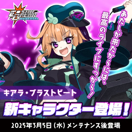 サイバーステップ株式会社は、MMO対戦アクションゲーム『CosmicBreak Universal(コズミックブレイク ユニバーサル)』にて、2025年3月5日(水)より新キャラクター「キアラ・ブラストビート」(CV:愛原ありさ)が登場することをお知らせします。