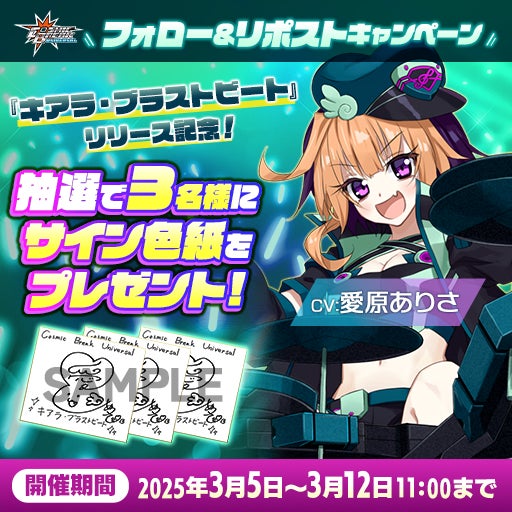新キャラクター「キアラ・ブラストビート」の登場を記念して、CVを担当する愛原ありさ氏のサイン色紙をプレゼントするリポストキャンペーンを実施します!