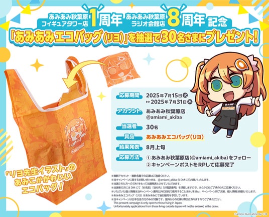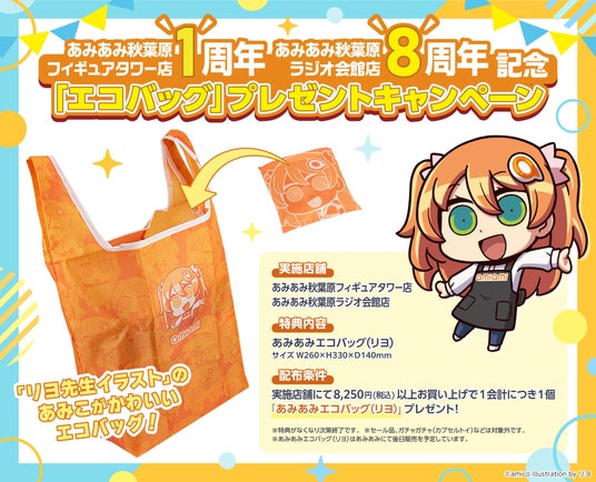 大網株式会社(本社・東京都文京区)は、自社が運営するホビーショップ「あみあみ秋葉原フィギュアタワー店」1周年、「あみあみ秋葉原ラジオ会館店」8周年を記念して、「あみこちゃん あみあみエコバッグ(イラスト:リヨ)」をプレゼントするキャンペーンを店頭とオンラインで開催。