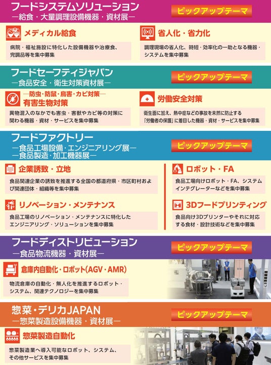 本年のFOOD展では、各展ごとに業界注目のピックアップテーマを多数設置。関連セミナーや企画展示など、積極的なPRを予定しており、課題解決を求める来場者との質の高いマッチング機会を創出します。