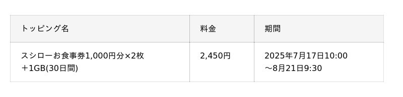 KDDI、沖縄セルラーは2025年7月17日から、povo2.0の期間限定トッピングとして、「スシローお食事券(1,000円分×2枚)」と「1GB(30日間)」がセットになったトッピングを2,450円で提供します。データ購入とあわせて、スシローでのお食事をおトクにご利用いただけます。