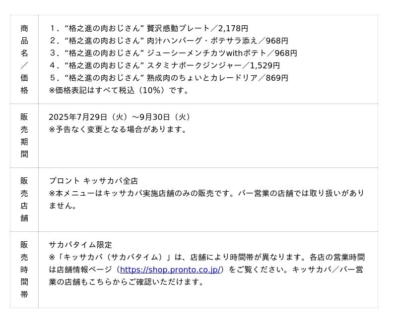 株式会社プロントコーポレーション(本社:東京都港区、代表取締役社長:杉山和弘)は、飲食チェーン『PRONTO(プロント)』の「キッサカバ(サカバタイム)」にて「格之進の肉おじさん」とコラボレーションした肉料理5品を、2025年7月29日(火)より発売します。