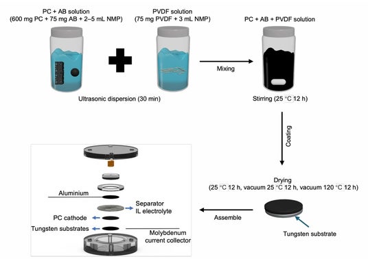PC正極の作製とアルミニウムイオン電池(AIB)セルの作製と構造
