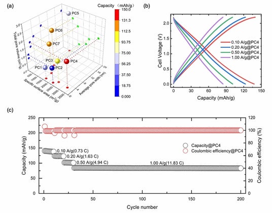 (a) 正極活物質としてPC1、PC2、PC3、PC4、PC5、PC6、PC7を用いたAIBの電流密度0.10A/gにおける放電容量と細孔特性。(b) 正極活物質としてPC4を用いたAIBの異なる電流密度における定電流充放電曲線。(c) 正極活物質としてPC4を用いたAIBの繰り返し特性、クーロン効率とCレート。