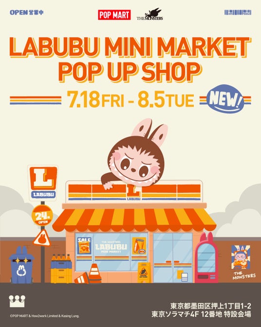 世界のポップカルチャーとエンターテイメントをリードする、国際的なアートトイ ブランドPOP MART(ポップ マート)の日本法人である、株式会社POP MART JAPAN(東京都港区、代表取締役:文 徳一)は、POP UP SHOP「LABUBU MINI MARKET」を東京ソラマチにて7月18日にオープンいたします。