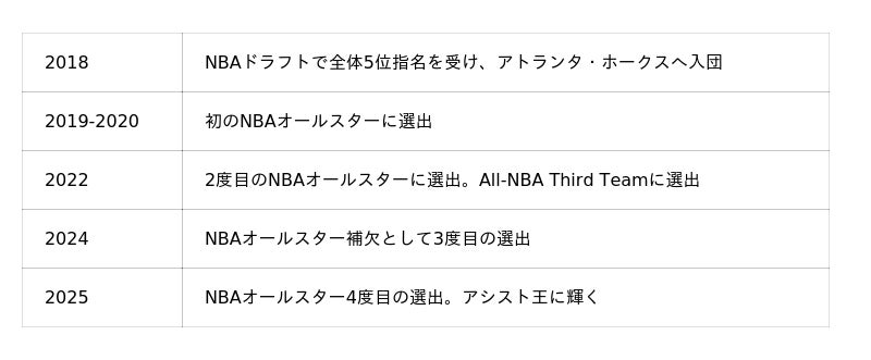 2024-25シーズンでは4度目のNBAオールスター選出に加え、アシスト王としても名を刻むなど、その卓越したゲームメイク能力と勝負強さでNBAを代表する司令塔としての地位を確固たるものにしました。深いレンジからのシュート力とパスセンスが高く評価されており、ポイントガードとしてリーグを牽引し続けています。