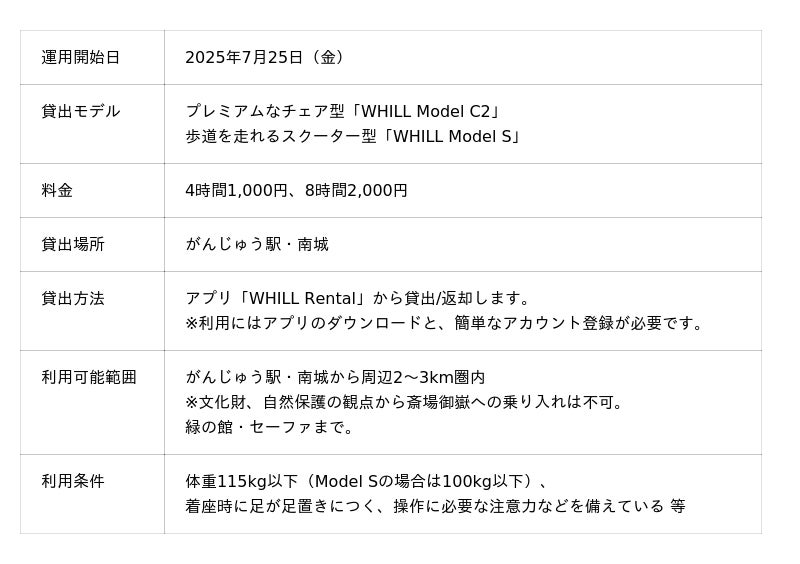 南城市観光協会(所在:沖縄県南城市)は、沖縄トヨタ自動車株式会社(以下「沖縄トヨタ」)ならびにWHILL株式会社(以下「WHILL社」)と協業し、自然ならではの道や地形が多い中でも、誰もが点在する見どころへ足を運んでいただきやすくするためのアクセシビリティ環境整備の一環として、WHILL社が開発する免許不要の近距離モビリティWHILL(ウィル)を活用した移動サービスを2025年7月25日(金)から提供開始することを発表いたします。沖縄県を代表する聖地ともいわれる「斎場御嶽」の入り口である「緑の館・セーファ」までや、絶景が見られる「知念岬公園」までの移動手段を確保することで、滞在時間の延伸や来訪の促進などを目指します。また、貸し出しは専用アプリを活用した非対面型にすることで、管理者側の運用オペレーションの省力化と効率化を図ります。