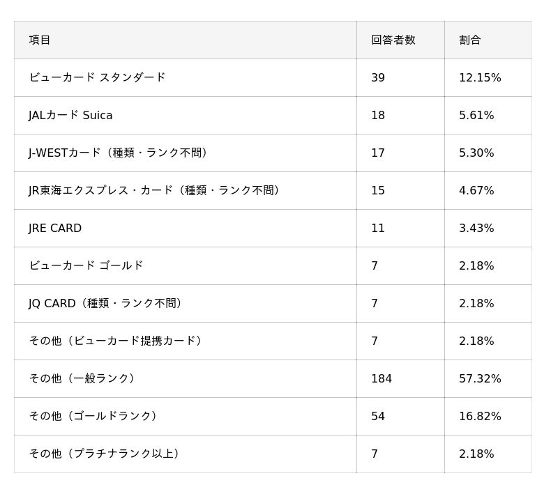 - 新幹線チケットを購入する際に利用しているクレジットカードは「ビューカード スタンダード」が最多で、全体の約1割を占める。