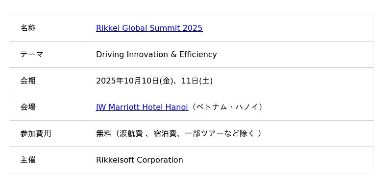 ベトナム最大級のITソリューションプロバイダーであるRikkeisoft Corporation(本社:ベトナム・ハノイ、代表取締役会長 タ・ソン・トゥン、以下「リッケイソフト」)は、2025年10月10日(金)、11日(土)に、ハノイのJW Marriott Hotel Hanoiにて国際テクノロジーイベント「Rikkei Global Summit 2025」を開催いたします。