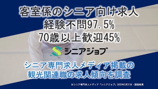 シニア転職支援の(株)シニアジョブ(本社:東京都新宿区/代表取締役 中島康恵/以下、シニアジョブ)は、サービス提供するシニア専門求人メディア「シニアジョブ」に掲載された、客室係、フロント、旅行手配員など観光関連職種の求人の傾向調査結果を発表しました。客室係では経験不問求人が97.5%、70歳以上歓迎求人が45%と大きい割合を占めるなど、職種によっては未経験で年配の方でも採用されやすいことがわかりました。