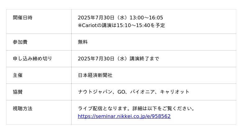 株式会社キャリオット(本社:東京都港区、代表取締役社長 齋藤 洋徳)は、日本経済新聞社が主催する、日経メッセ プレミアム・カンファレンス・シリーズ「社用車・営業車管理DXで実現する経営力強化~安全運行とコンプライアンスの最前線~」に登壇することをお知らせします。