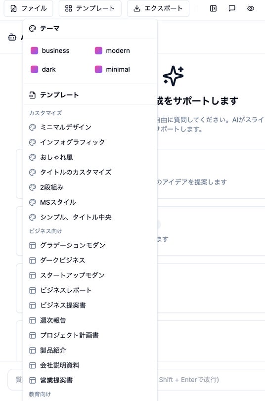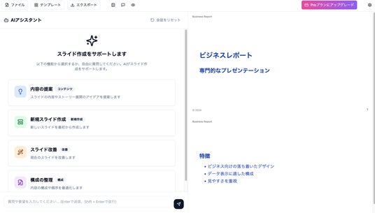 ChatGPTをベースにしたAIアシスタントと対話するだけで、スライド資料に必要な内容の骨子からデザインの提案までを自動でサポート。