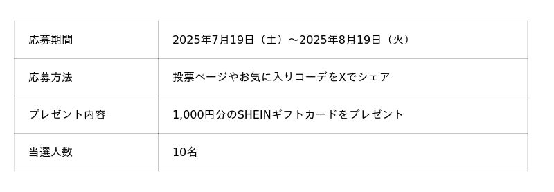また、投票期間中には、あなたのお気に入りコーディネートをXでシェアすると、抽選で10名様に1,000円分のSHEINギフトカードが当たるキャンペーンも同時開催!今回のコラボを記念して、最大25%オフでお買い物を楽しめるスペシャルクーポンも配布します。さまざまなシーンで活躍する夏アイテムを、ぜひお得にゲットしてください。