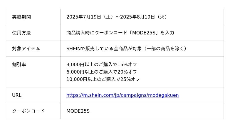 今回「モード学園」とのコラボを記念し、お気に入りコーデをXでシェアすると、抽選で10名様に1,000円分のSHEINギフトカードをプレゼントいたします。また、最大25%オフでお買い物をお楽しみいただける期間限定クーポンを配布いたします。ぜひこの機会に、最新の夏トレンドアイテムを、よりお得にゲットしてみるのはいかがでしょうか。
