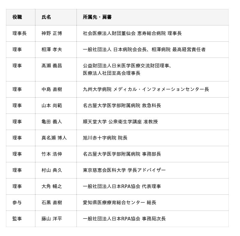 一般社団法人メディカルRPA協会(所在地:東京都港区、以下「メディカルRPA協会」)は、2025年7月8日付で現理事長 石黒 直樹が退任し、同日付で、現理事の神野 正博が理事長に就任したことをお知らせいたします。