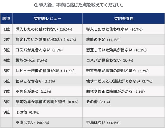 不満点については、契約書作成・レビューツールでは「導入したのに使われない」が20.0%で最多、「想定していた効果が出ない」が14.7%、「コスパが見合わない」が9.8%と続きました。契約書管理ツールでは「導入したのに使われない」が10.7%、「機能の不足・使い勝手」が10.2%、「想定していた効果が出ない」が10.1%という結果となりました。