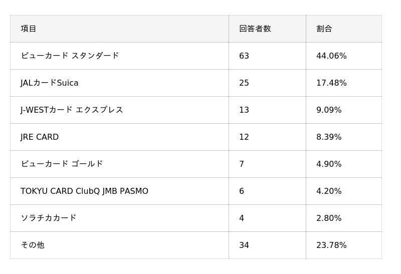 - 所有している交通系クレジットカードは「ビューカード スタンダード」が最多で約44%。次いで「JALカードSuica」が約17%を占める。