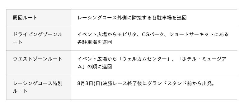 イベント広場からレーシングコースに隣接する各駐車場、ウェルカムセンター、ホテル、ミュージアムを巡回する『場内シャトルバス』にご乗車いただけます。