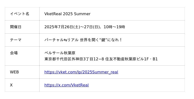 世界最大級のメタバースイベント「バーチャルマーケット(Vket)」を運営する株式会社HIKKYは、バーチャルとリアルを融合させたXR体験型リアルイベント『VketReal 2025 Summer』を、2025年7月26日(土)~27日(日)に東京・ベルサール秋葉原にて開催いたします。