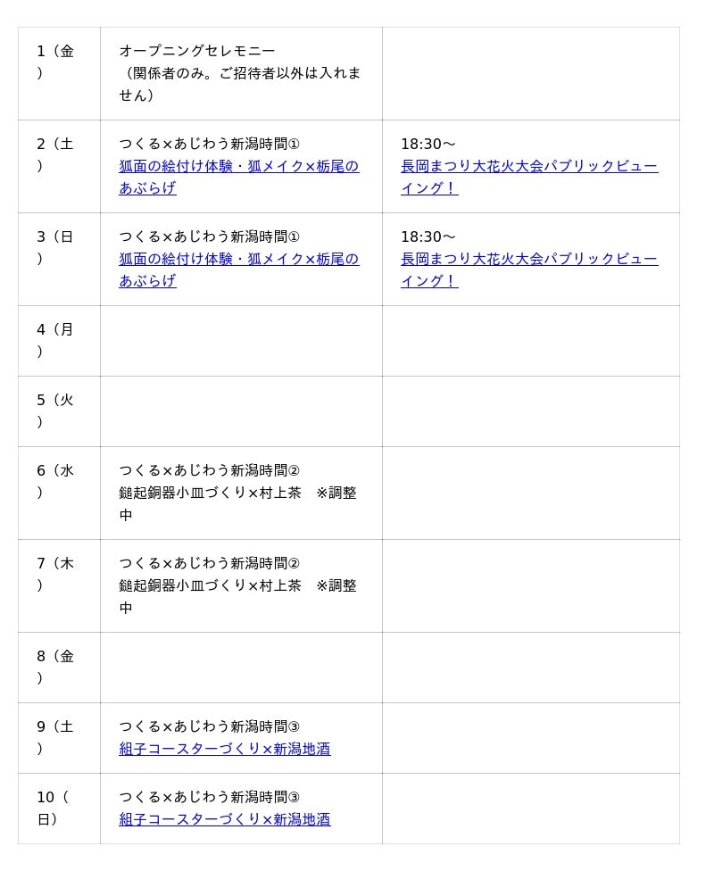 新潟の伝統・文化、ものづくりに触れられる体験型ワークショップと、新潟の美味しいものを同時に味わえるイベント「つくる×あじわう新潟」を3種類ご用意いたしました。また、8/2(土)と3(日)の夜には、新潟の夏の風物詩であり、日本三大花火にも数えられる長岡花火のパブリックビューイングを開催いたします。