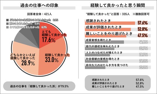 回答者全体の421人に過去の仕事について聞くと、「経験して良かった派」が79.5%と過半数を占め、内訳は「とても経験して良かった」が17.6%、「経験して良かった」が33.0%、「どちらかといえば経験して良かった」が28.9%となりました。経験して良かったと回答した335人にその瞬間を聞くと、「感謝されたとき」が57.6%で最多となり、次いで「成果が評価されたとき」が52.8%、「難しいことをやり遂げたとき」が47.5%となりました。