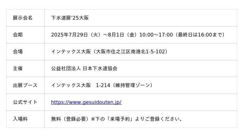 「下水道展」は、公益社団法人日本下水道協会が主催する、国内最大級の下水道関連専門展示会で、下水道インフラの維持管理・防災・再構築・DX・GXをテーマに全国から業界関係者が集う一大イベントです。