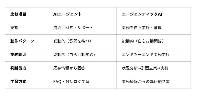 従来のAIエージェントが「質問応答型」であったのに対し、「Agentic AI」は「自律業務実行型」として以下の革新的特徴を持ちます:<従来AIエージェントとの根本的違い>
