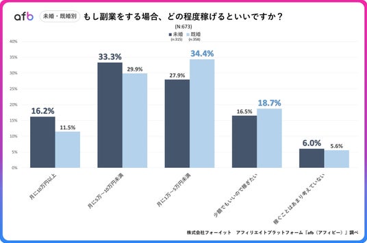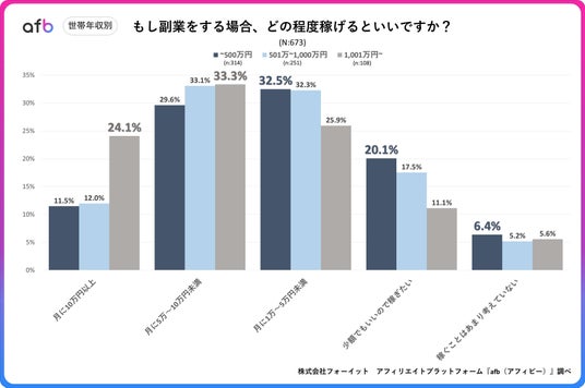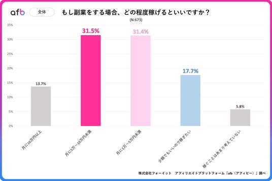 アフィリエイトプラットフォーム「afb(アフィビー)」< https://www.afi-b.com/ >の開発運用をおこなう株式会社フォーイットは、全国の20代~60代までの男女673人を対象に副業に関するアンケートを実施し、年代別等の特徴についてまとめました。