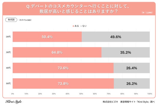 年代別に見ると、年代が下がるにつれて、デパートのコスメカウンターへの抵抗感も少なくなるという結果になり、20代と50代では23.4%の差が出る形となりました。