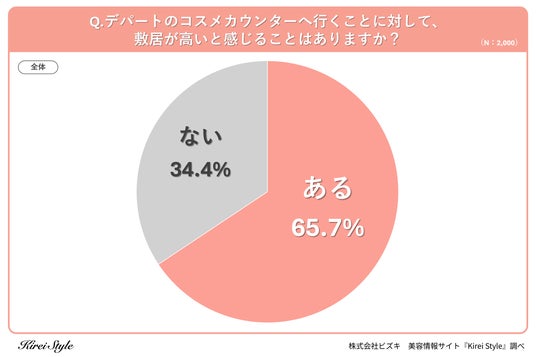 全国の20代~50代の女性2,000人を対象に、「デパートのコスメカウンターへ行くことに対して、敷居が高いと感じることはありますか?」というアンケートを実施したところ、「ある」という方は65.7%、「ない」という方は34.4%と、敷居が高いと感じている方が過半数を超える結果となりました。