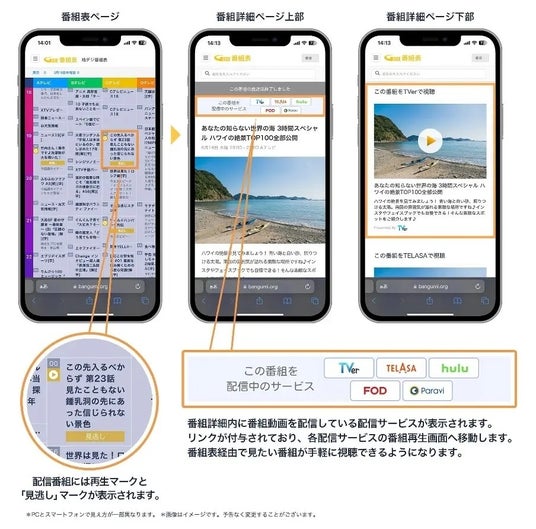 全国の放送局および配信サービスを運営する事業社から公式に番組コンテンツのデータをご提供いただいているWebブラウザ版の番組表です。月間アクティブユーザーが約700万人(※5)にものぼる国内最大級の電子番組表サービスです。(※5)2024年10月~2025年4月集計平均▼Webブラウザ版「番組表.Gガイド」はこちら