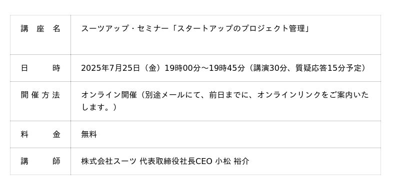 当社では、2025年7月25日(金)19時から、当社代表の小松が講師を務めるスーツアップ・セミナー「スタートアップのプロジェクト管理」を無料開催します。
