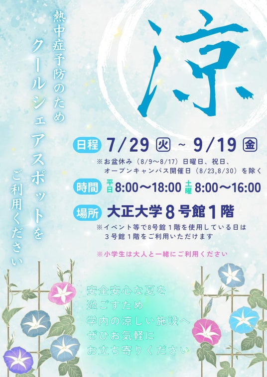 大正大学(学長:神達知純、所在地:東京都豊島区)は、連日続く猛暑による熱中症予防対策として、キャンパス内の一部施設を「クールシェアスポット」として一般の方にも開放いたします。快適な空調環境のもと、「涼」をとり、安心して過ごせる場として、大学キャンパスを活用できます。