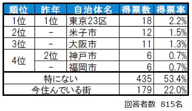 「住みたい街が特にない」53.4%、「今住んでいる街に住み続けたい」22.0%の合計75.4%で、昨年に引き続き、今住んでいる街を評価する結果となっています。