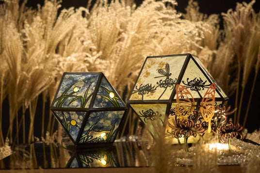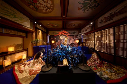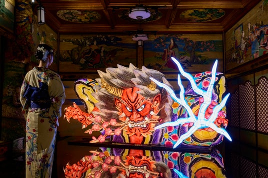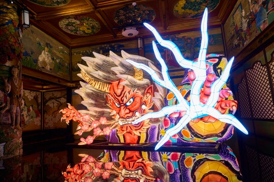 類稀な彩りに満ちた唯一無二の文化財「百段階段」。エントランスと99段の階段廊下が繋ぐ7つの部屋には、鬼の世界に誘うように幻想的で繊細な「希莉光あかり」や、かんざし作家 榮 -SAKAE-氏による「青彼岸花」、そして全長約4.6mを誇る大迫力の「青森ねぶた」など、38名のアーティストの感性が共演。歩を重ねるたびに没入感溢れる「百鬼繚乱」の世界が展開していきます。