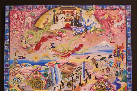 鬼が去り、まさに桃源郷のような都を表現した展示です。雅やかで淡い色彩のアートにより、桃と梅と桜が一斉に咲いたような、希望と喜びに満ちた景色が広がります。