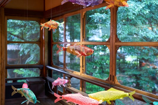 階段廊下の最後の部屋 頂上の間では、鬼との長い闘いが終わった日常を表現。窓越しの緑が美しい空間に、金魚やにしきごいが泳ぎます。