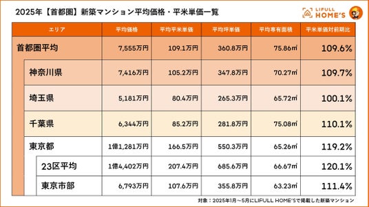 ・集計対象:東京都、神奈川県、埼玉県、千葉県内で分譲された新築マンションのうち、LIFULL HOME'Sに掲載された物件を行政区&自治体単位で集計・集計期間:2024年1~5月および2025年1月~5月を比較し対前期比を算出