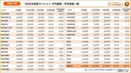 事業を通して社会課題解決に取り組む株式会社LIFULL(ライフル)(本社:東京都千代田区、代表取締役社長:伊東祐司、東証プライム:2120、以下LIFULL)が運営する不動産・住宅情報サービス「LIFULL HOME'S(ライフルホームズ)」は、2025年における東京23区の新築マンションの平均価格調査に続き、神奈川県、埼玉県、千葉県の新築マンションの平均価格をもとに市区町村単位で調査し、発表します。
