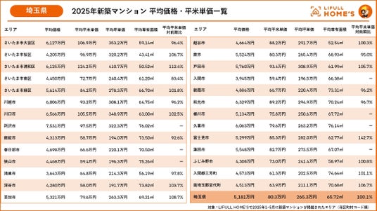 神奈川県、埼玉県、千葉県の2025年新築マンションの平均価格をLIFULL HOME'Sが調査