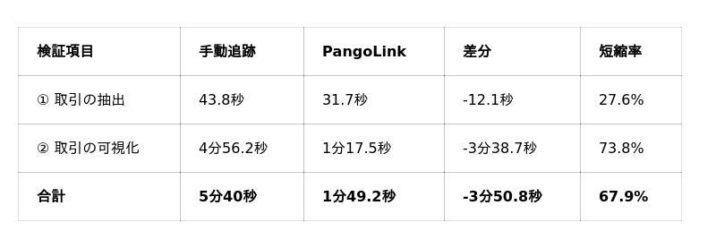 本検証の結果、PangoLinkは従来の手動追跡に比べ、調査プロセス全体で約70%、特に調査の核心となる資金の流れの可視化において、作業時間を約74%も短縮できることが実証されました。