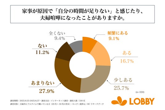 また、「家事が原因で『自分の時間が足りない』と感じたり、夫婦喧嘩になったことがあるか」を尋ねる設問への回答では、1位が「あまりない」で27.9%、2位が「少しある」で25.7%、3位が「ある」で16.7%という結果になりました。「ある(少しある、ある、頻繁にある)」の回答を合計すると回答率50%を超える形となり、この結果から、共働き世帯の20代~50代男女の半数以上が、家事が原因で少なからず「自分の時間が足りない」と感じたり、夫婦喧嘩になったりしていることが明らかになりました。