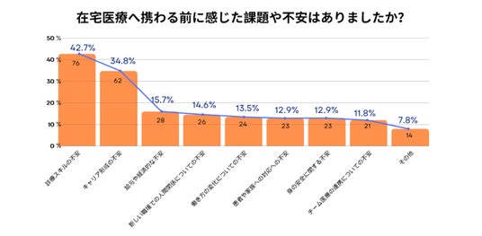 在宅医療へ携わる前に感じた不安としては、「診療スキルへの不安」(42.7%)が最多で、次いで「患者や家族への対応への不安」(34.8%)が続きました。医療機器が限られた環境での判断や、患者家族との密なコミュニケーションは、経験豊富な医師にとっても難易度が高いと感じられており、在宅医療の担い手が増える上での大きな課題となっています。