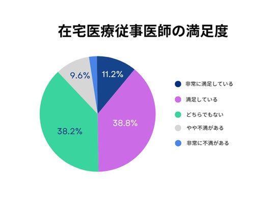 在宅医療への満足度について、「非常に満足している」(11.2%)、「満足している」(38.8%)を合わせると、全体の50%が肯定的に評価しています。自由記述では「患者の人生に深く関われる」「自分の裁量で診療できる」といった声が多く、病院診療とは異なる魅力がやりがいにつながっていることが伺えます。
